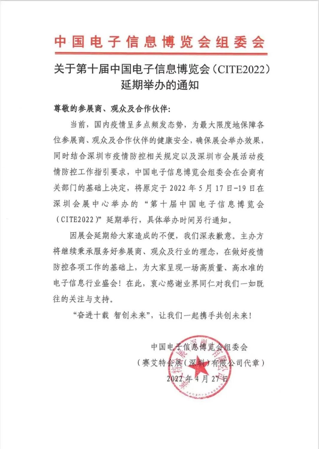 鑒于近期多地疫情變化影響,為確保參會人員的健康安全,保證展會效果,經(jīng)多方溝通研判,組委會決定,原定于5月17-19日第17屆中國車聯(lián)網(wǎng)大會暨智能駕駛及汽車安全技術(shù)展將延期舉行,具體舉辦時(shí)間另行通知。